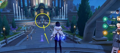 2、从传送点出发,沿着下图中的箭头,一直往前走直到欧庇克莱歌剧院旁边,走到供奉池所在的位置。