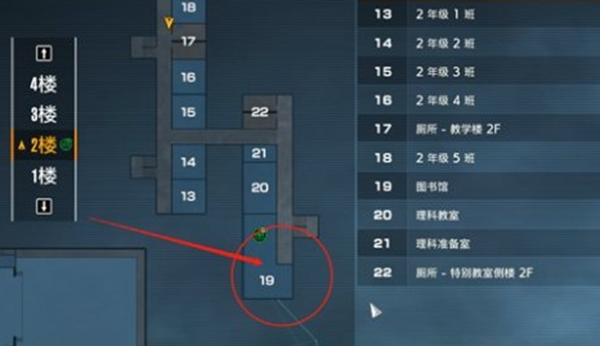 1、首先玩家可以打开地图,在左侧一栏点击2楼,红色箭头所指的19号房间就是图书馆的位置。